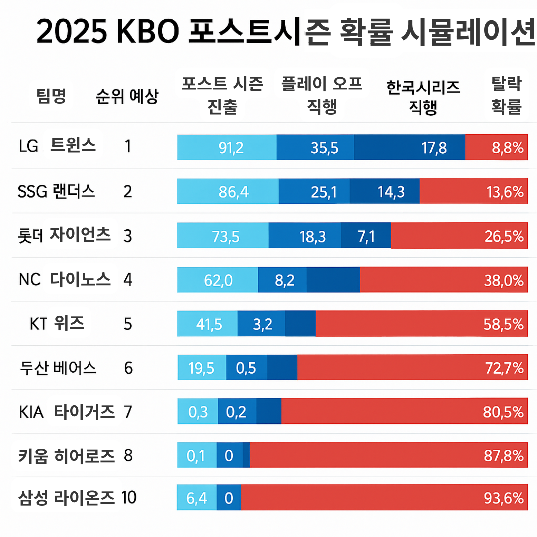 - LG 트윈스: 포스트시즌 확률 91.2%, 플레이오프 직행 확률 35.5%